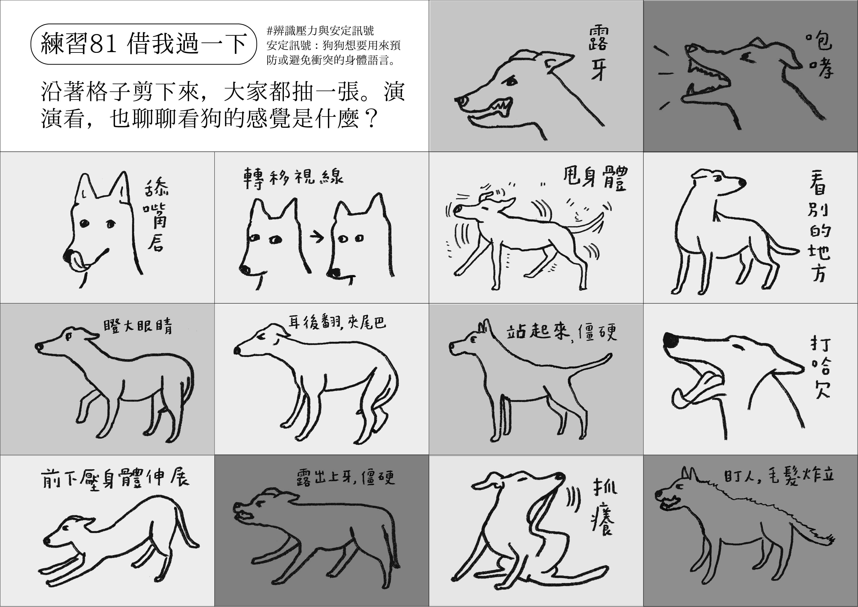 今天我們準備了三種壓力情境,請大家根據狗狗的肢體語言,利用手邊的身體語言卡來回應牠。