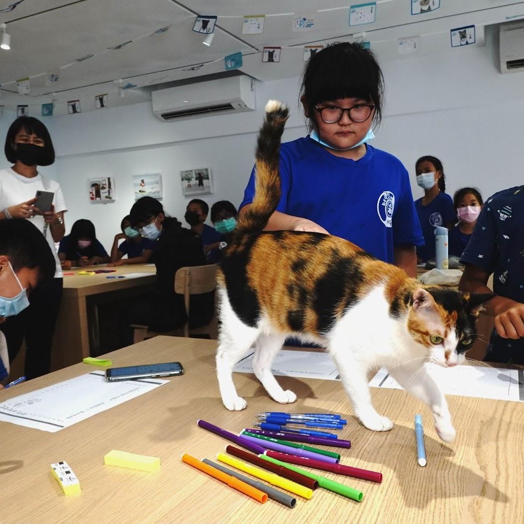 第一堂課是狗狗課,狗二班的助教小美上場與學生們會面,讓學生觀察牠得體語言閱讀安定訊號。貓二班則是全員出動滿場跑,每個孩子都非常努力的當「隱形人」,在不給貓過度壓力的原則下與貓互動相互認識。